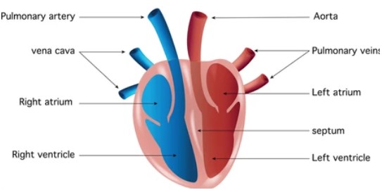 심장은 심방사이막 interatrial septum에 의하여 오른심방과 왼심방, 그리고 심실사이막 interventricular septum에 의하여 오른심실과 왼심실로 구분합니다. 위쪽에 위치하는 심방 atrium들은 벽이 얇고 매끄러운 속면을 갖고 있는데 비하여 아래쪽의 심실 ventride들은 벽이 매우 두껍고 속면은 근육기둥 trabeculae carneaed나 꼭지근 papillary muscle 및 힘줄끈 tendinous cord 등에 의하여 불규칙하게 되어 있습니다.